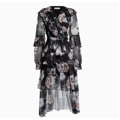 AUI黑色气质v领碎花雪纺连衣裙女新款设计感御姐修身长裙