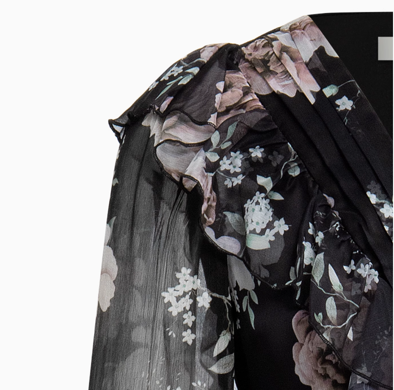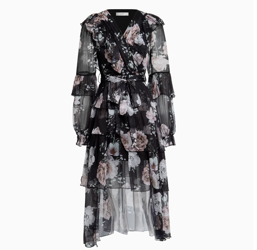 AUI黑色气质v领碎花雪纺连衣裙女新款设计感御姐修身长裙